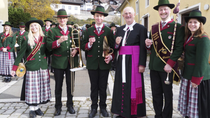 Nach der Festmesse wurde zu einem gemütliches Beisammensein in die Säulenhalle geladen. Davor allerdings überraschten die Musikerinnen und Musiker der Bürgermusik den neuen Seelsorger noch mit einem Ständchen und hießen ihn mit einem gemeinsamen Schluck aus dem Fässchen der Marketenderinnen herzlich willkommen.