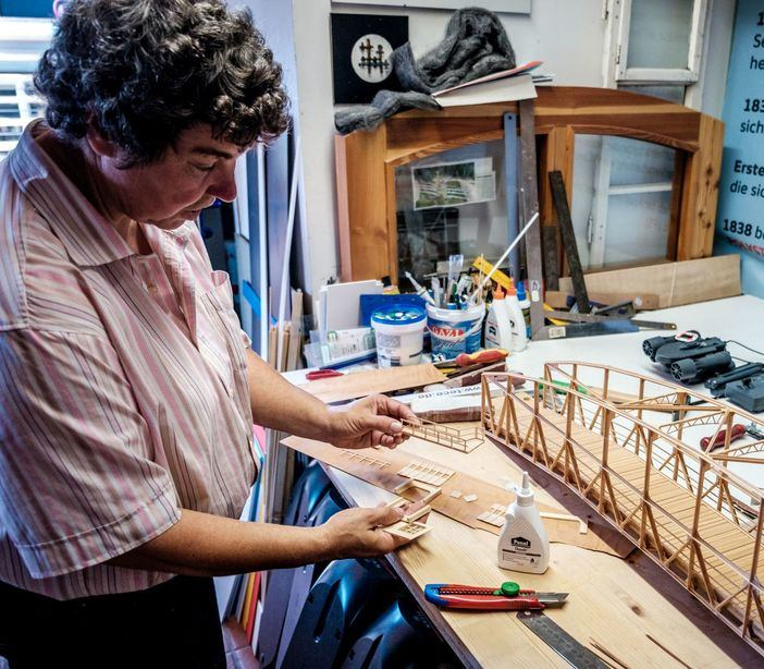 Die lebt aber nicht nur für und im Museum. Sie hat dort auch ihre Werkstatt und jeder kann ihr über die Schulter schauen, wenn sie bei den filigranen Modellen ihrer Eisenbahnbrücken, Straßenbrücken, Pionierbrücken, Behelfsbrücken oder Sonderbrücken mit einer Eselsgeduld und einem unglaublich handwerklichen Geschick Stück für Stück entstehen lässt.