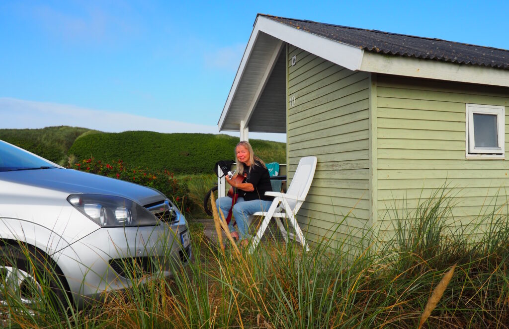 Völlig unerwartet traf mich die Musik auch auf einem Campingplatz in Hive Sande. Das ist an der Nordküste Dänemarks und nur eine Sanddüne trennt den Campingplatz von der Nordsee. Wellenrauschen und Windpfeifen sind dort kein Lärm, sondern gehören zur Stille. Keine Angst, man gewöhnt sich daran. Aber ausgerechnet in dieser Stille hörte ich an einem frühen Morgen eine zarte Stimme, die harmonisch Balladen trällerte. Natürlich habe ich zuerst an ein Radio gedacht. Aber dann war die Musik doch zu authentisch, zu lebendig. Handgemacht würde ich sagen, dieser Ausdruck trifft es wohl am besten. Ich machte mich auf die Suche nach dem Ursprung der zarten Stimme im rauen Wind. Und stand bald bei Hieke. Die saß vor ihrem Bungalow, spielte Gitarre, sang dazu und ließ sich von mir überhaupt nicht stören. Das gefiel mir. Und als ich Hieke nach drei oder vier Balladen um ein zusätzliches Lied für mich bat, bekam ich dieses auch und wir kamen ins Plaudern.